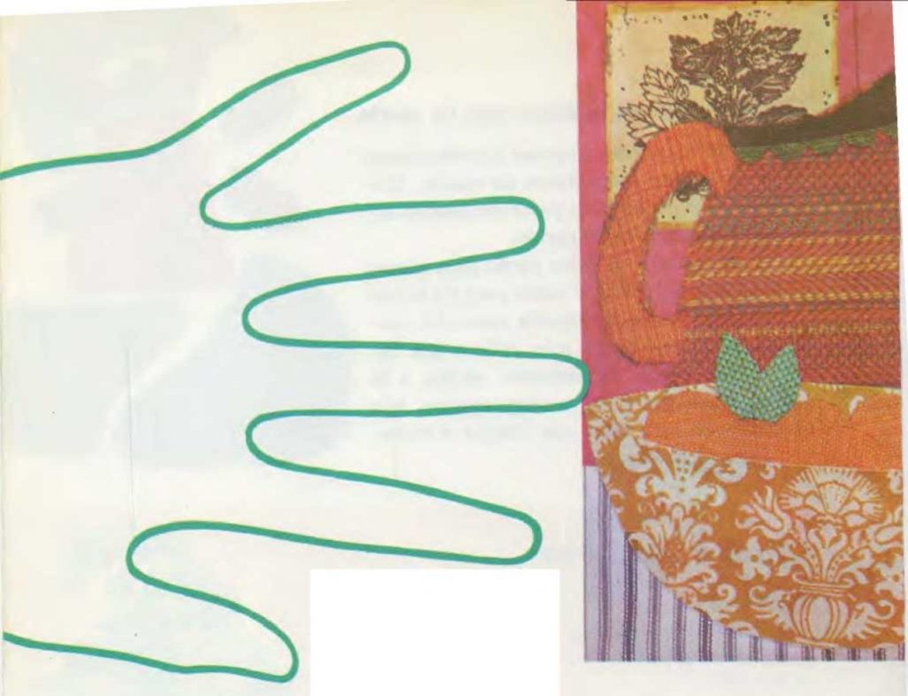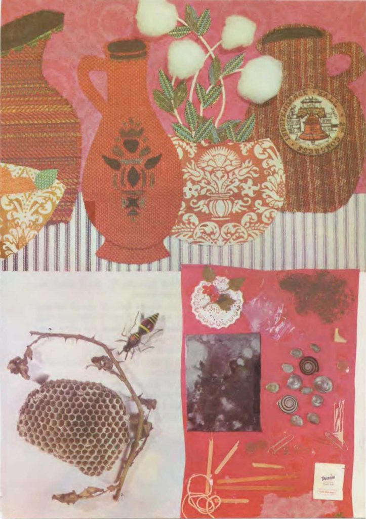 Puedes hacer composiciones artísticas con cosas lisas, nudosas, punzantes, duras, suaves, ásperas, rizadas, etc. También puedes hacer una composición con muchos trozos diferentes de una misma cosa, como hebras de hilo o retales de tela. Estas composiciones agradables para verlas y tocarlas se llaman collages. Puedes recoger piezas para hacer un collage en cualquier parte: en el bosque, a la orilla de un río o incluso en un montón de chatarra. También será original un collage hecho con tuercas, cortezas u hojas de árbol, trozos de leña y manojos de hierba; o con algodón, botones, lazos y cintas. Cualquiera que sea el material que escojas, ponlo sobre una hoja de papel grande. Muévelo de un lado a otro, hasta que forme la clase de cuadro que más te gusta. Después, pégalo con cola o sujétalo al papel con grapas o cinta adhesiva. Producirá un bonito efecto decorativo colgado en la pared. |