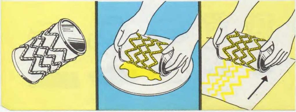 Una lata vacía te servirá como rodillo impresor para trazar bonitos dibujos sobre papel y envolver con éste los regalos que hagas. Cubre con cinta adhesiva el borde afilado de la parte abierta de la lata para no cortarte con él. Enrolla la cuerda alrededor de la lata y utiliza pegamento para fijarla. Observa el dibujo. También puedes cortar la cuerda en varios trozos y pegarlos uno a uno sobre la lata. Dobla cada trozo en la forma que desees antes de pegarlo en el lugar previsto. Asegúrate de que el pegamento está bien duro antes de empezar a imprimir con el rodillo. Pon pintura de gouache en el plato hondo. Haz rodar la lata en la pintura, la cual empapará la cuerda, pero no se adherirá al metal. Después, haz rodar la lata sobre una hoja de papel y así quedará impresa la forma de la cuerda. Cada vez que hagas rodar la lata sobre el papel, deberás haberla pasado antes por el plato con pintura. Puedes imprimir el dibujo tantas veces como quieras. Prueba a hacer otros dibujos con retales de tela, de lana o fieltro.