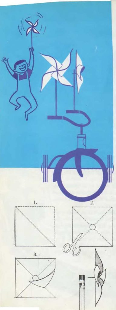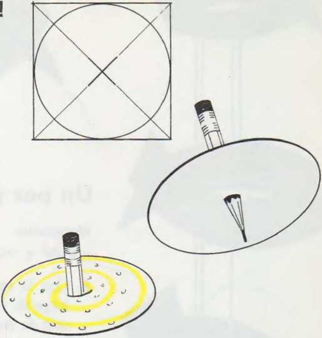 El papel para construir el molinete tiene que ser cuadrado. Asegúrate de ello doblándolo, antes de cortarlo, como indica la figura 1. Traza líneas en diagonal, de esquina a esquina del papel, con ayuda de una regla. Dibuja un pequeño círculo, aproximadamente del tamaño de una moneda, en el centro del papel donde las líneas se cruzan. Observa la figura 2. Corta el papel siguiendo las líneas hasta el círculo. Inclina cada una de las esquinas marcadas con una «X» en la figura 3 hacia el centro del círculo. Atraviesa con un alfiler recto las cuatro esquinas y el centro del papel y clava el alfiler en la goma del extremo del lápiz. Ya está listo el molinete, dispuesto a girar cuando soples delante de él o corras sosteniéndolo en tu mano. Decóralo con dibujos variados; así formará bonitas figuras al girar. |