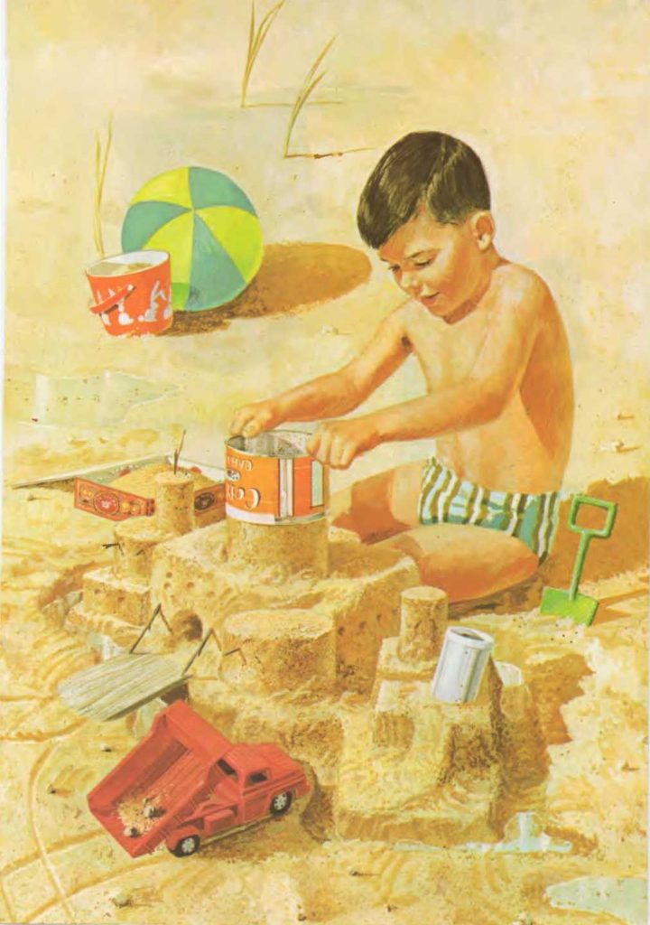 Cubre los bordes con cinta adhesiva. Ahora, ya estás preparado para construir castillos y bloques de arena. Deposita la lata sobre la playa. Llénala con arena húmeda. Levanta la lata poco a poco y comprueba cómo la arena queda muy lisa y ha tomado la forma de la lata. Cada una puede dejar una forma diferente. Con una lata plana obtendrás la forma de una barca; con otra alta y redonda, la torre de un castillo.