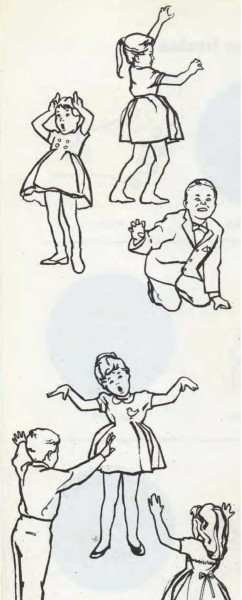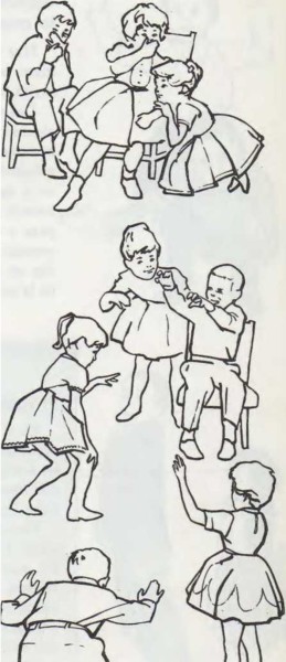 O bien, el director brinca y dice: «¡Los conejos saltan!» Y entonces todos los invitados saltan y gritan: «¡Los conejos saltan!» Pero si el director dijera: «jLos patos maúllan!» o «jLos conejos ladran 1», los invitados no deben imitarle. El que agite sus brazos o salte cuando no debiera, pasa a ser el vigilante. Cuando sólo queda una persona, ésta se convierte en el director.