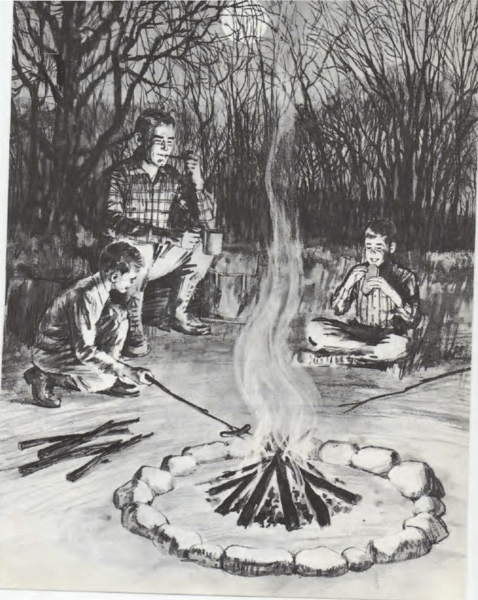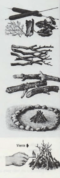 Para hacer un fuego de campamento puedes empezarlo con cualquier material que arda fácilmente: trozos de corteza de ramas secas o de troncos de árboles caídos. También sirven las hojas secas y brozas. Coloca después encima leña ligera que arda con facilidad. Para este uso son apropiadas las ramas secas. Y, finalmente, coloca el verdadero combustible, es decir, la leña que mantendrá vivo el fuego. Busca leños o trozos de ramas caídas que tengan unos 30 cm de longitud. Lo más seguro es encender el fuego sobre una roca o sobre arena o tierra, lejos de cualquier cosa como hierba u hojas secas que pudieran propagar el fuego, y rodear la hoguera con una circunferencia de gruesas piedras. Si quieres hacer un fuego para cocinar, pon una pequeña pirámide de leña sobre un puñado de ramillas. Para encender el fuego tienes que dar la espalda al viento. Enciende esas ramillas con una cerilla y, cuando la leña haya prendido también, añade gruesos troncos. Al empezar a arder éstos, agrega al fuego troncos todavía más gruesos hasta que la hoguera tenga las proporciones deseadas. Ahora ya puedes cocinar. |