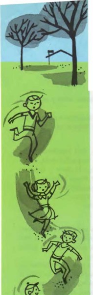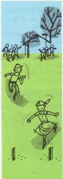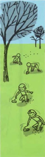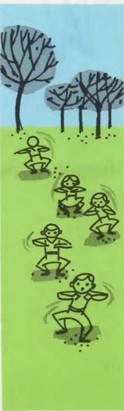 Cambiando de asiento: todos los jugadores se sientan en el suelo formando círculo. El jugador designado se queda en el centro y nombra a otros dos jugadores. Éstos deben cambiar de asiento. Mientras lo hacen, el jugador del centro trata de sentarse en uno de los dos asientos. Si lo logra, el que queda sin asiento pasa al centro del círculo. | Carreras de relevos