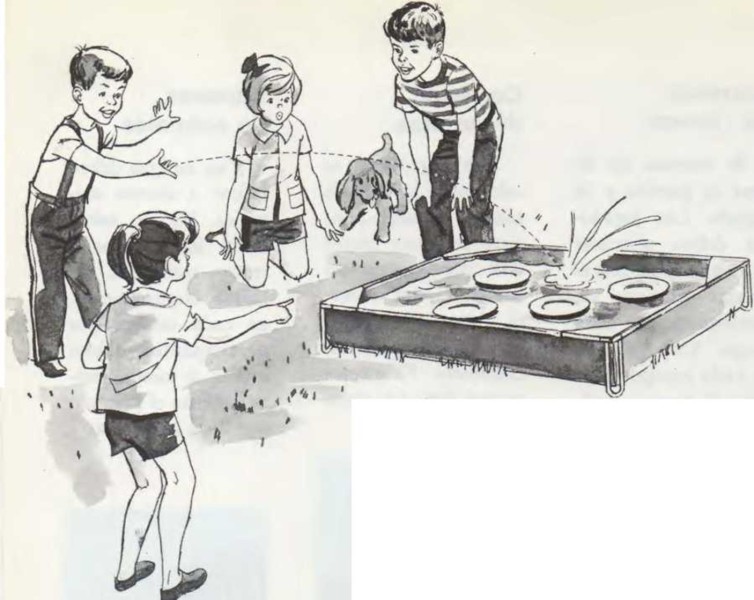 Llena de agua el recipiente o la piscina. Haz flotar en el agua las tapaderas o los platos.