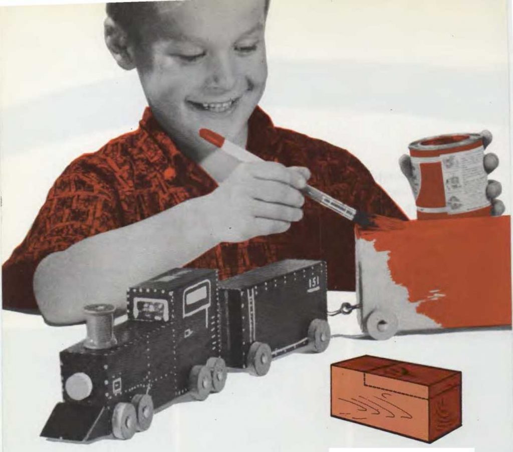Con papel de lija, pule la superficie de la locomotora y de todos los vagones. Después píntalos. Pinta también las ruedas. Las ilustraciones pueden darte idea sobre el modo de pintar los vagones.
