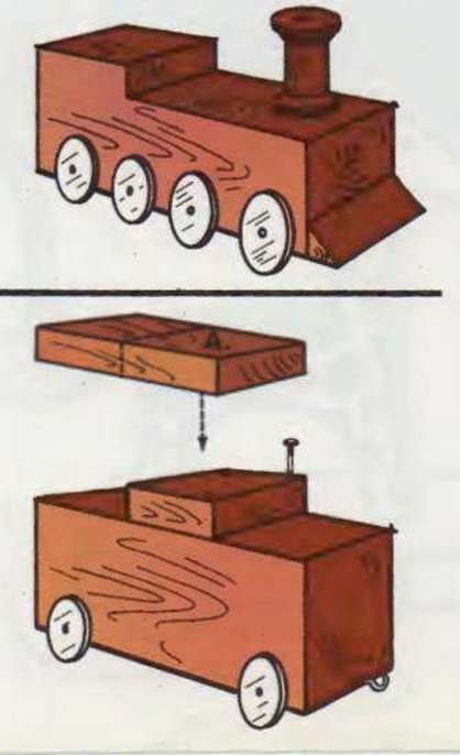 La locomotora tiene una cabina para el maquinista. Esta cabina es más alta que la parte delantera de la máquina, con objeto de que el maquinista pueda ver la vía férrea. La ilustración muestra cómo diseñar la locomotora. Con la sierra, corta la sección A.