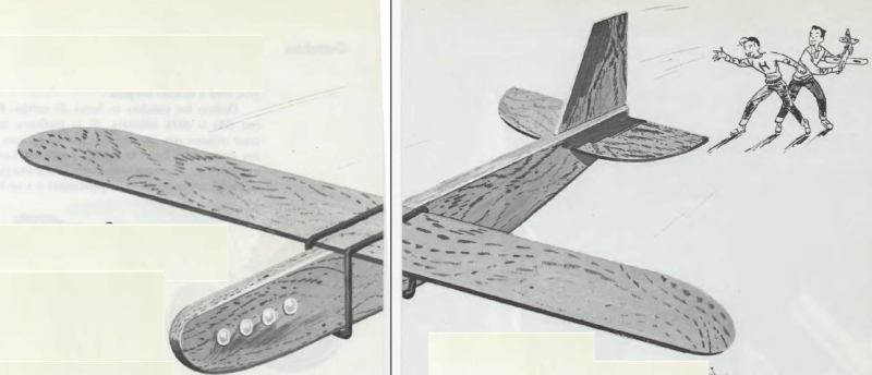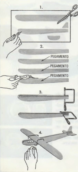 Corta las piezas con tijeras. Corta tres más para el fuselaje. Pule las piezas con papel de lija y une las cuatro con pegamento. Cuando esté seco, con una sierra de marquetería haz varias ranuras para los dos timones y fíjalos a él también con pegamento.