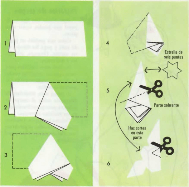 Con estas instrucciones lograrás hacer una estrella de seis puntas. Si cortas ángulos en los bordes de la estrella doblada, obtendrás un dibujo semejante a un copo de 7 nieve. Empieza con una hoja cuadrada de papel.