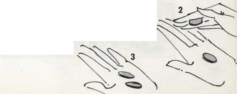 Ahora, di a tus amigos que la moneda mágica no tardará en multiplicarse por dos. Déjala en la palma de la mano izquierda y restriégala varias veces con la mano derecha. Mientras la restriegas, deja que la otra moneda se desprenda de los dedos y vaya a parar a la palma de la mano. Abre la mano y enseña las dos monedas.