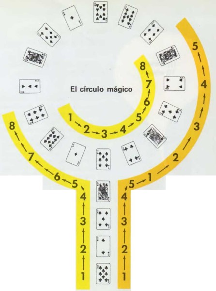 Para adivinar en qué carta ha terminado de contar basta que tú mismo cuentes el número de cartas que están en columna (5) y luego cuentes este mismo número hacia la derecha del círculo: la última será la elegida por tu amigo. |