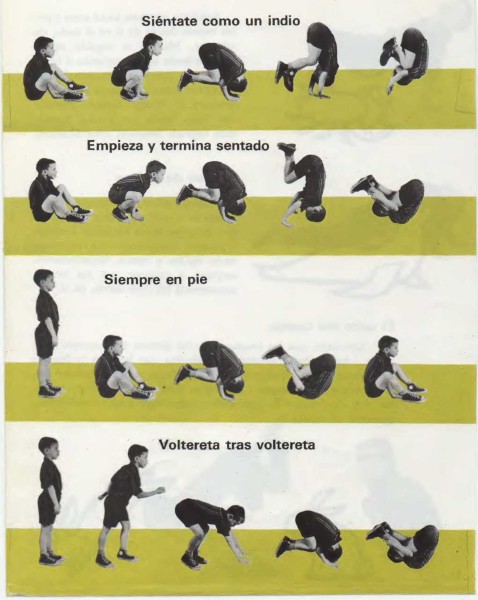 Siéntate como un indio Siéntate como un indio, con las rodillas separadas, encima de una alfombra o del césped. Apoya las manos en el suelo, entre las piernas. Álzate sobre las manos y los pies con las piernas dobladas. Después, apoya la barbilla en el pecho y curva la espalda hacia delante. Date impulso con las piernas y los brazos hasta que empieces a rodar. Cuando des la vuelta, cruza las piernas y termina sentándote. Es preciso que tu cabeza no toque la alfombra. Practica esta pirueta hasta que la hagas apoyándote sólo en los hombros y cargando tu peso en las manos y los brazos. Empieza y termina sentado Siéntate como antes y coloca las dos manos en el suelo, delante de los pies. Avanza la espalda y apoya la barbilla en el pecho. Impúlsate con los pies y las manos para dar la vuelta; mantén dobladas las piernas. Termina sentado. Siempre en pie Empieza de pie y erguido. Después, abre las piernas y agáchate. Adelanta tu espalda y apoya la barbilla en el pecho. Impúlsate con los pies y las manos para dar la vuelta. Mantén las rodillas dobladas hasta terminar la voltereta. Luego, endereza las piernas y ponte otra vez de pie. Voltereta tras voltereta Cuando sepas dar las volteretas anteriores, trata de efectuarlas más deprisa y seguidas, o combinándolas. Impúlsate con las manos y apoya siempre la barbilla en el pecho. |