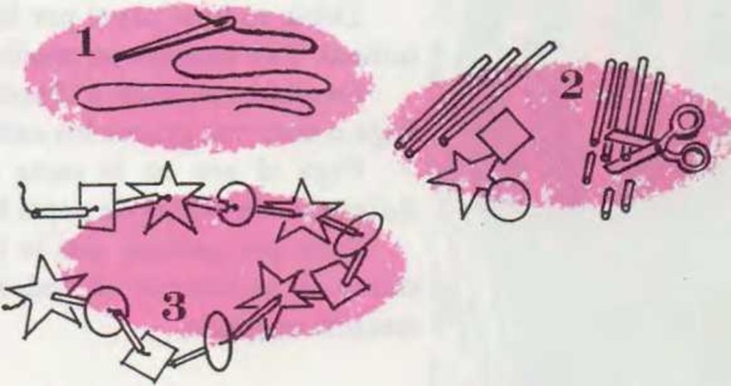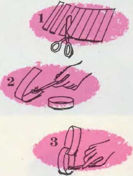 Materiales: • papel de colores • tijeras • pegamento 1. Corta el papel en tiras de 10 a 12 cm de largo cada una. 2. Coge una de las tiras de papel y haz un anillo. Engoma los extremos. 3. Con otra tira de papel haz un nuevo anillo, pero pasa previamente la tira por dentro del anillo anterior. Añade tantos anillos como quieras. De este modo, la cadena será tan larga como se te antoje. Esos anillos se hacen también con papel blanco, que puedes decorar con dibujos a tiza, papeles de colores o de estaño. Si quieres, adorna cada anillo con trochos de papel brillante. De este modo, la cadena resplandecerá por las noches. |