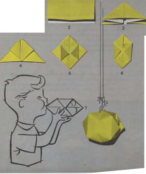 Es fácil construir globos de papel: sigue las instrucciones y figuras de esta página. Empieza con una hoja de papel cuadrada. Dóblala como indican las líneas de puntos en la figura 1. Después, pliega otra vez el papel y alísalo antes de empezar la próxima operación. Cuando ya hayas hecho todos los pliegues (fig. 6), ínflalo como si fuera un globo. |
