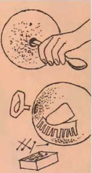 Puedes usar una bola de gomaespuma para hacer una cabeza de títere. En este material es fácil cortar, pegar y clavar agujas. Usa el mango de una cuchara para hacer en la bola un agujero del diámetro de un dedo. Mira la ilustración. Inserta en la bola trozos de cartón para que representen la nariz y las orejas. También se fijan sin dificultad con alfileres. Las hebras de lana pegadas figurarán el cabello. Usa tizas para colorear la boca, los ojos y los otros rasgos de la cara. |