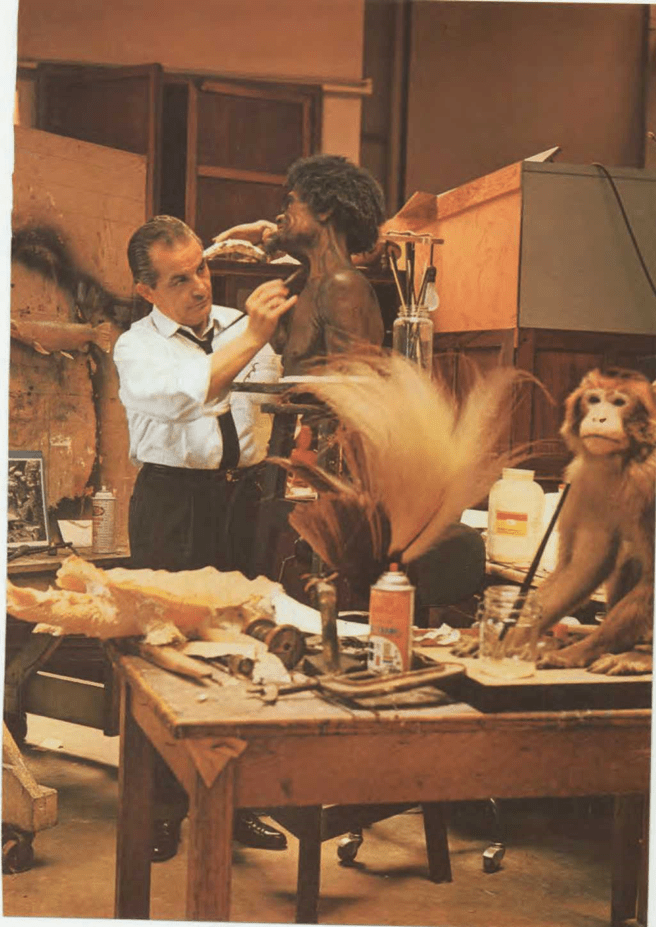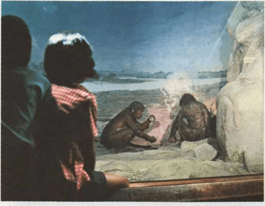Estamos ante un diorama en un museo de historia natural. El diorama es un modelo construido después de recoger todos los datos referentes a determinado asunto. En este caso se ha construido el modelo de una caverna habitada por figuras similares a las que vivieron hace muchos años, todo lo cual se ha colocado ante un telón de fondo cuidadosamente pintado. Con esta clase de modelos se consiguen representaciones casi reales.