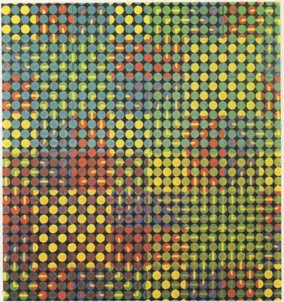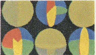 Si observas una parte de esta ilustración utilizando una lente de aumento la verás tal como aparece al pie de la página anterior: una serie de puntos. Mira las dos grandes manchas de la parte superior izquierda y derecha. Puedes ver unas manchas amarillas, otras rojas y, en los lugares donde los puntos azules están impresos sobre puntos amarillos, otras de color verde oscuro.