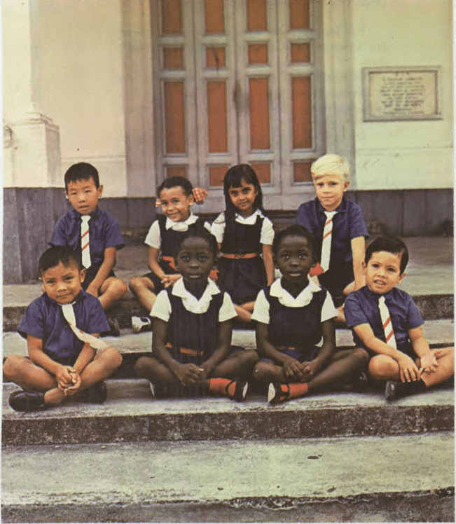 En la fotografía hay niños de cuatro razas. Por la forma de sus ojos puedes reconocer al niño chino que representa a la raza amarilla. Las dos gemelas de la primera fila son de raza negra, Los dos niños de la derecha son de raza blanca, uno de pelo rubio y el otro de pelo negro. Las dos niñas y el niño restantes son descendientes de indios americanos y tienen la piel morena.