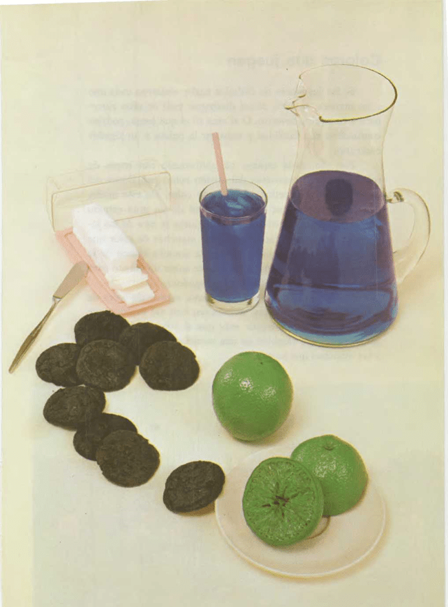 este libro lo tenia y la coleccion . curiosamente todos los productos ya estan en existencia en el mercado . las naranjas verdes dulces las hacen geneticamente en japon . las galletas negras pueden ser de chocolate dark o brownie . la limonada azul es una bebida con alcohol , limones y curacao azul . la margarina blanca existen algunas variedades artesanales del producto que sale mas puro y con sabor a nata