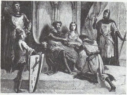 En el grabado, un rey de la época medieval arma caballero a uno de sus súbditos