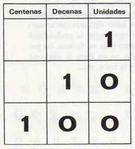 Entonces, el último 0 quiere decir ninguna unidad. El 0 del medio significa ninguna decena y el 1 significa un centenar.