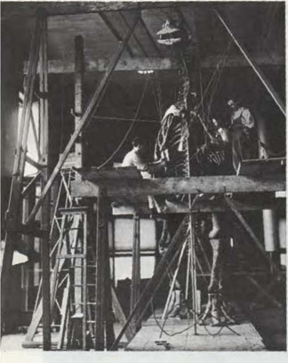 Después, durante semanas enteras, unos trabajadores se afanaron en construir los modelos correspondientes, hechos con arcilla, cartón, yeso, alambre, tubos, piedras e incluso con partes de la auténtica osamenta del dinosaurio.