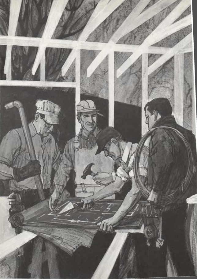 El arquitecto ha hecho en los planos unos dibujos especiales que, sin reproducir exactamente nada, indican a la persona que dirige los trabajos materiales de la construcción los distintos detalles que harán habitable la casa.