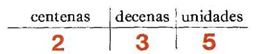 Nuestro sistema numérico tiene una base de diez. Cuando llegamos al diez, empezamos a contar por decenas. Cuando llegamos al cien (diez decenas) empezamos a contar por centenas, y así sucesivamente. El número 235 está formado por dos centenas, tres decenas y cinco unidades: