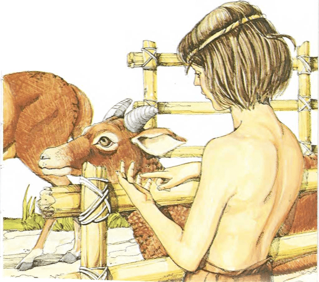 Era muy temprano cuando Amú, el pastorcillo, caminaba hacia el redil silbando alegremente. Su única vestimenta era una corta falda hecha de piel de animal. En una mano llevaba su almuerzo, un pedazo de queso envuelto en hojas.