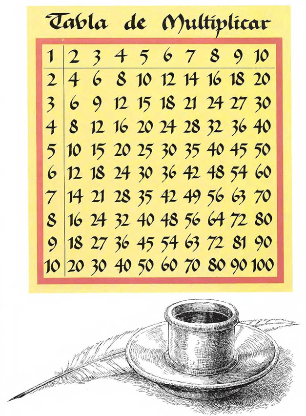 Hace unos quinientos años, a una persona muy inteligente se le ocurrió la idea de dibujar diez filas de diez cuadrados cada una, y poner un número en cada cuadrado. Esto es lo que ahora conocemos como tabla de multiplicar. Hace quinientos años, cualquier persona que trabajase mucho con números tenía una de estas tablas, al igual que hoy día se dispone de una calculadora de bolsillo. Si alguien quería saber cuántas eran nueve por diez, como Ahmose, buscaba el cuadrado donde se cruzaban la fila que empezaba con nueve y la fila que empezaba con diez en el otro lado. Y en ese cuadrado estaba la respuesta.