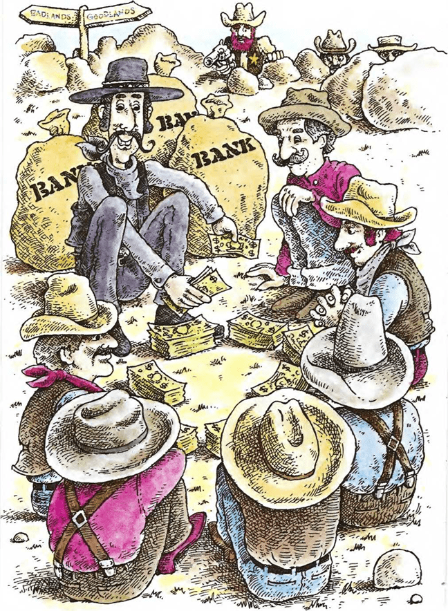 Una hora más tarde, mientras Slim todavía estaba contando el dinero y haciendo siete montones, llegó el sheriff con sus ayudantes y detuvo a toda la banda.