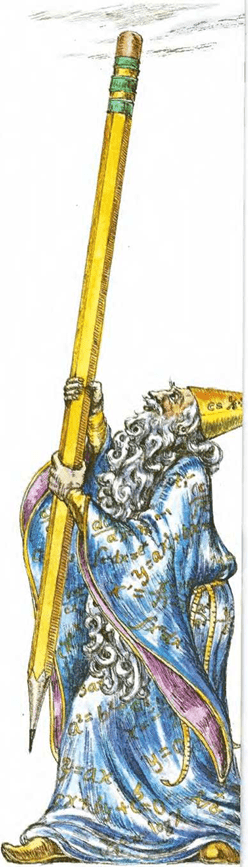 Vestía una airosa túnica enteramente cubierta de complejas ecuaciones matemáticas, y un gorro altísimo en forma de cucurucho que le daba aspecto de sabio. En la mano izquierda llevaba un enorme báculo que acababa, por un lado, en punta de lápiz, y en una gran goma de borrar por el otro.