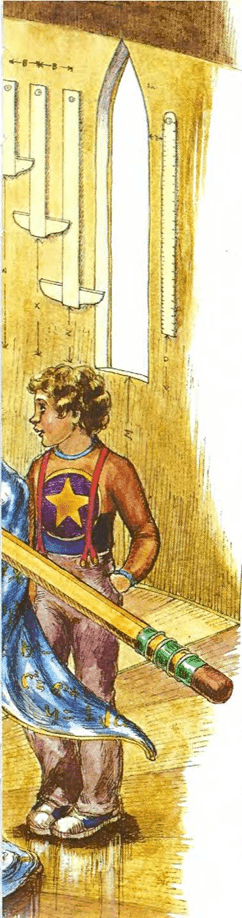 —No, ciertamente —replicó el Matemago, y, levantando esta vez el báculo por el extremo de lápiz, dibujó en el aire una fina línea; después caminó graciosamente de un extremo a otro de la habitación—. Por lo general suelo seguir la distancia más corta entre dos puntos. Y, desde luego, cuando he de estar en varios sitios a la vez —puntualizó, mientras escribía