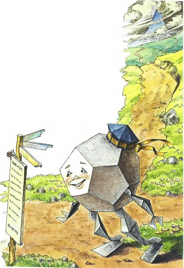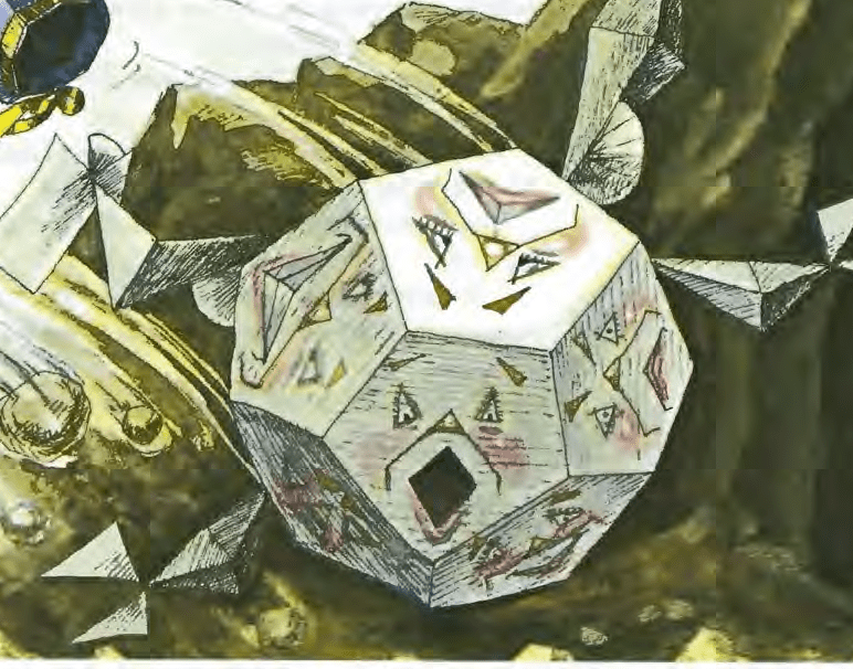 Esta vez, el Dodecaedro salió rodando montana abajo, con la cabeza por delante, haciendo muecas y gruñendo hasta quedar posado con el lado triste hacia arriba, en lo que parecía la entrada de una cueva.