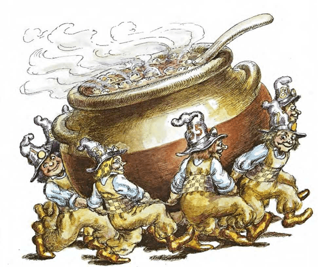 Rápidamente entraron en la caverna ocho de los mineros más fuertes transportando una inmensa sopera que hervía y humeaba, mandando al techo grandes nubes de oloroso vaho, que ascendían en lentas espirales.