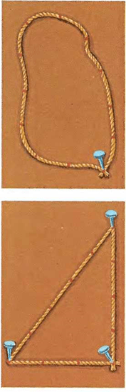 Cuenta tres marcas a partir de la esquina. Atraviesa esta marca con una chincheta. Pon bien tirante la cuerda y clávala a la madera. Vuelve a la chincheta de la esquina y cuenta cuatro marcas. Atraviesa esta cuarta marca con otra chincheta. Tira de la cuerda hasta que los tres lados estén tensos. Clava a la madera la chincheta de la cuarta marca. Ya tienes un triángulo “mágico*’.