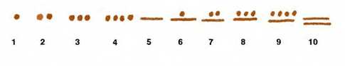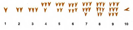 Los mayas construyeron una gran civilización en América Central hace unos 1.800 años. Fueron los únicos indios de América que desarrollaron una forma avanzada de escritura. Y trabajaron mucho con los números. Cuando aprendían a contar debieron usar los dedos de las manos y de los pies, pues su sistema numérico se basa en el veinte. Sus números del uno al diez eran así: