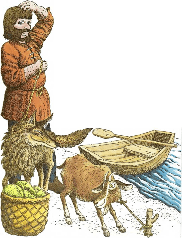 Un día, le encargaron pasar tres cosas a la otra orilla: un lobo, una cabra y una enorme cesta de coles. Como sólo podía pasar una cosa cada, vez, habría de dejar dos y volver después por ellas. jY ahí estaba el problema!