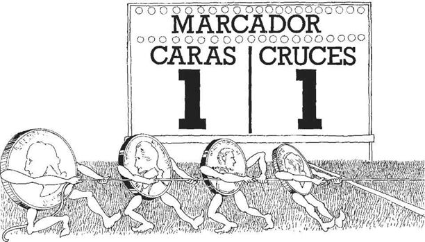 Cuando hayas lanzado la moneda cincuenta veces, cuenta las marcas de las “caras” y las de las “cruces”. Verás que hay casi las mismas. Puede que haya unas cuantas caras más, o unas cuantas cruces, pero la diferencia no será mayor de dos o tres. Y si tiras la moneda al aire otras cincuenta veces, los resultados serán casi los mismos.