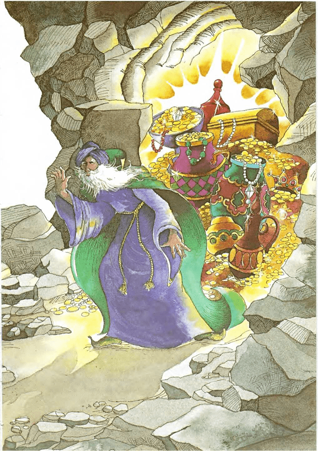 Pero ¿qué fue del príncipe Alí? Bien, sacó una piedra negra, naturalmente, y se llevó el gran Tesoro de Samarcanda.