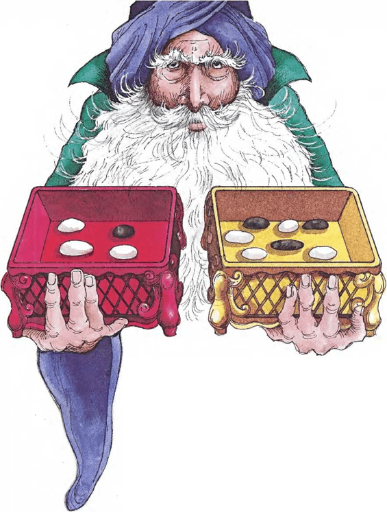 —En la caja roja hay cuatro piedras: una negra y tres blancas —dijo el hechicero—. En la caja amarilla hay siete piedras, tres negras y cuatro blancas. Sin mirar, has de tomar una piedra de una de las cajas. Si eliges una piedra negra, el tesoro es tuyo. Pero si te sale una blanca, te convertirás en estatua de piedra.