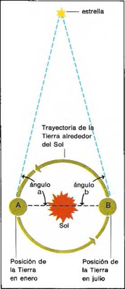 Si conoces tres partes de un triángulo, una de las cuales debe ser un lado, puedes calcular cada una de las otras tres partes. El diagrama te aclara cómo calculan los astrónomos la distancia de las estrellas.