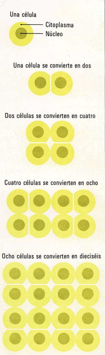 Hay más de cien millones de millones de células en mi cuerpo. Cada una de ellas crece sin cesar. Al cabo de cierto tiempo las células se dividen en dos. Estas dos células también crecen sin cesar. Y al cabo de cierto tiempo se dividen a su vez. Las cuatro células resultantes se dividen y forman ocho células. De este modo ocurre la división y crecimiento de las células.