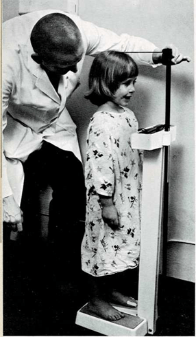 El médico tiene en su oficina una ficha con mi nombre. Cada vez que me visita hace unas anotaciones. Me pesa y apunta mi peso en la ficha. Mide mi estatura y anota también cuánto he crecido. Quiere cerciorarse de que mi peso y mi altura son los que corresponden a mi edad.