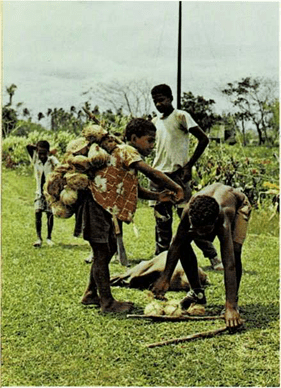En mi familia todos nos ayudamos cuando hay que hacer ciertos trabajos. Yo ayudo a fregar los suelos y a limpiar los platos. Mi hermano ayuda a limpiar los cristales de las ventanas. Trabajamos juntos muchas veces. Y lo mismo hacen miembros de otras muchas familias de todo el mundo. Los niños ayudan a llevar cocos al mercado.