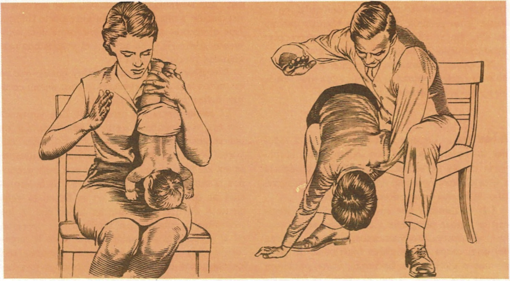 Si es un niño mayor, se le inclinará cabeza abajo sobre las rodillas golpeándole la espalda.