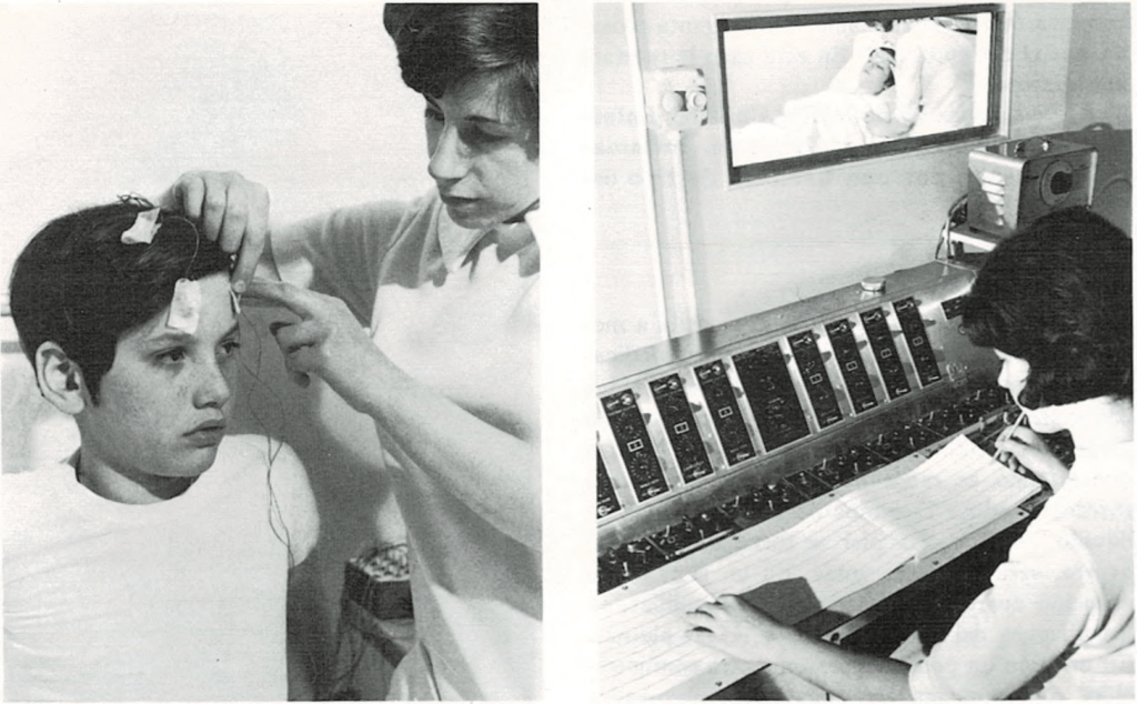 Un instrumento llamado electroencefalógrafo capta los impulsos eléctricos que emite la corteza cerebral (capa fina de células nerviosas que recubre la mayor parte del cerebro). Los impulsos son recogidos y conducidos por unos pequeños cables colocados en la cabeza y fijados por medio de esparadrapo o clips, reflejándose en una gráfica obtenida sobre papel que tiene la forma de una serie de líneas con ondas paralelas. No es necesario cortar el pelo del niño para efectuar esta prueba, que no produce ningún dolor y es de gran valor para el diagnóstico.
