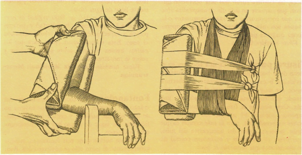 Se le pondrá un pañuelo atado al cuello que sostenga el brazo en esta posición. Luego se atarán las tablillas alrededor del cuerpo, con unas tiras de tela.