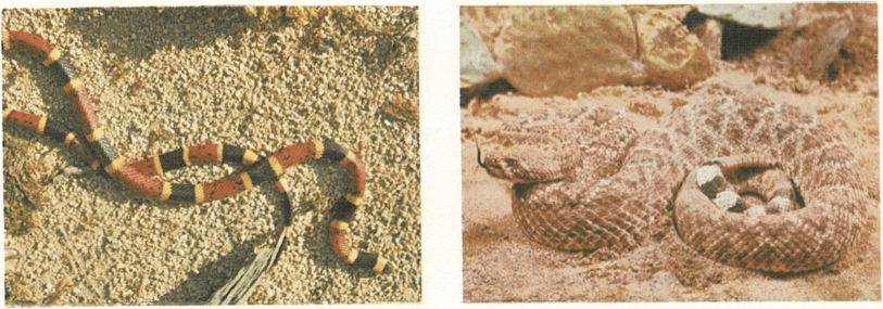 Cómo reconocer las serpientes venenosas. Entre otros, los tipos más comunes de serpientes venenosas son las víboras y la serpiente coral y pueden ser identificadas porque ambas espe cies tienen dos espolones en la cabeza. Las víbo ras ostentan una excavación o cavidad a cada lado de la cabeza, entre los ojos y las aberturas nasales. La serpiente de coral presenta amplias zonas negras azulinas en forma de bandas, sepa radas por espacios más claros. Muchas serpien tes tienen un dispositivo sonoro al final de la cola.