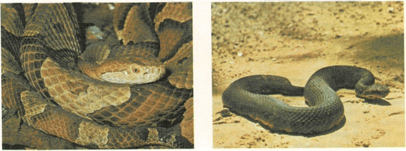 La serpiente mocasín tiene manchas oscuras en su cuerpo. Cuando la serpiente crece, se hace más difícil distinguirlas.