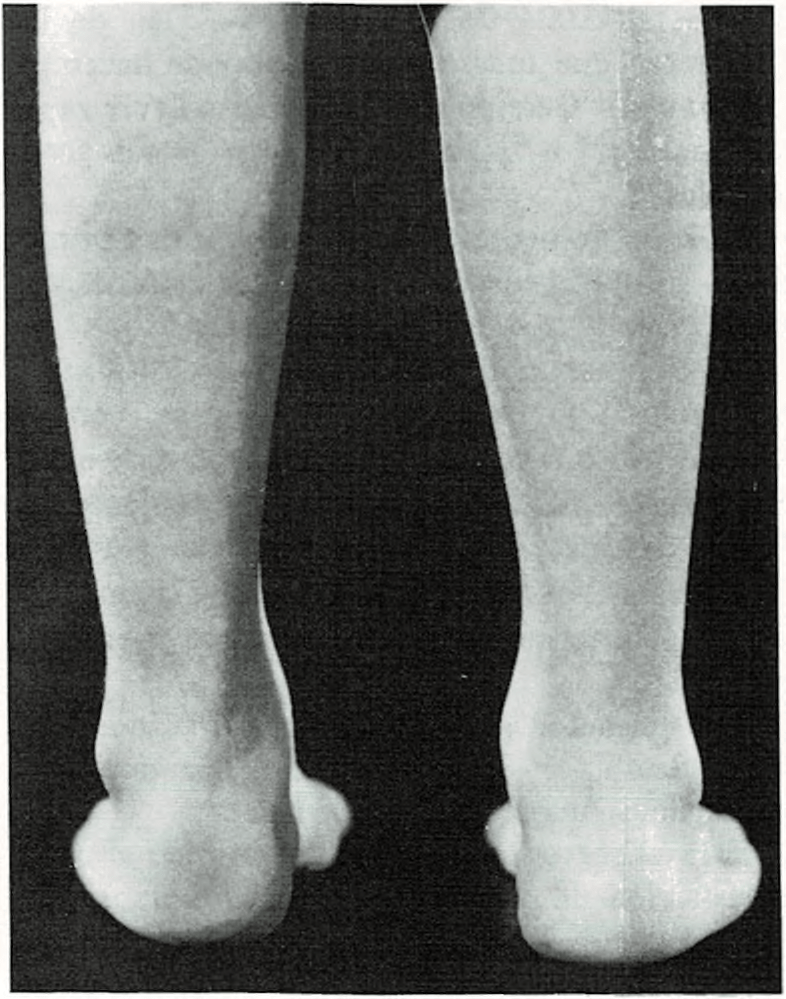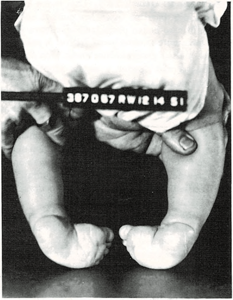 se hallan dirigidas hacia fuera y los pies ligeramente vueltos hacia dentro. A pesar de que los huesos generalmente están bien formados, las piernas tienden a seguir adoptando la posición que tenían en el claustro materno.